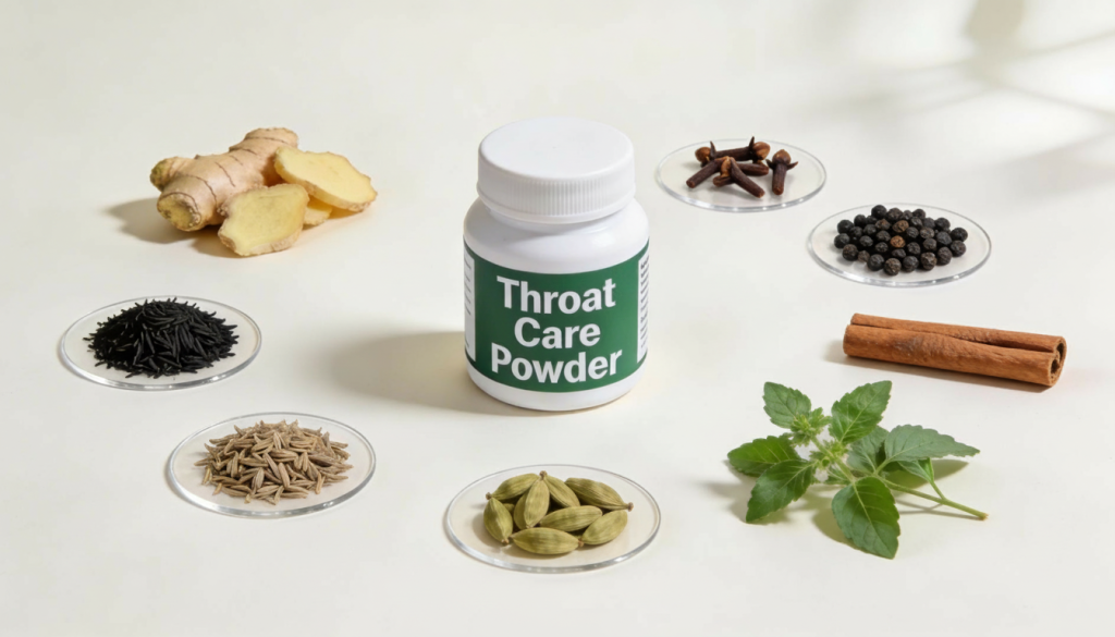 ১৭টিরও বেশি প্রাকৃতিক ভেষজ (তুলসি, লবঙ্গ, আমলকি, আদা, গোলমরিচ, যষ্টিমধু ইত্যাদি) দিয়ে বিশেষভাবে প্রস্তুত এই ভেষজ পাউডারটি গলা, কণ্ঠনালী ও শ্বাসনালীর ভেতরের লাইনিংকে সাপোর্ট করে।